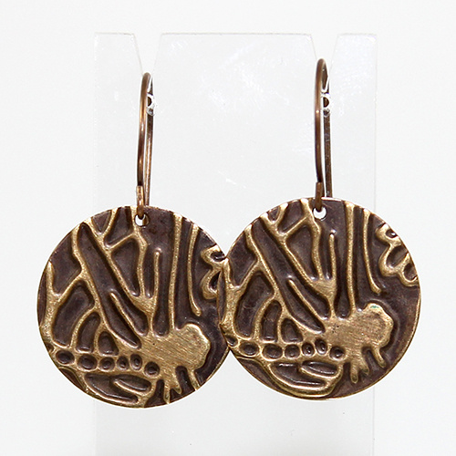This piece features handmade embossed pendants on antique brass ear hooks.