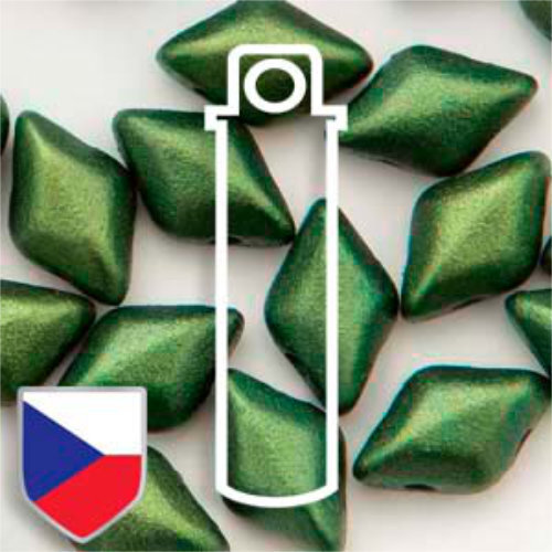 Style: Gem Duo Size: 8mm x 5mm Beads Inner Hole: 0.8mm Product Code: GD8502010-24103CS Colour: Gold Shine Dark Olive These gorgeous diamond-shaped glass beads have a flat bottom and raised beveled top that resembles a faceted gemstone. With two generously sized holes that run parallel through the points, they are perfect for bead stitching patterns, stringing projects, and more. These beads have been treated with Czech Shield - a transparent surface treatment for Czech Beads designed to increase colour durability and protection to Czech Bead Coatings.