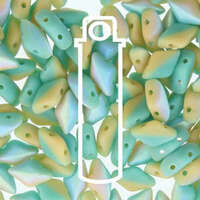 Style: Gem Duo Size: 8mm x 5mm Beads Inner Hole: 0.8mm Product Code: GD8563132-28771 Colour: Matte Duet Turquoise Green Ivory AB These gorgeous diamond-shaped glass beads have a flat bottom and raised beveled top that resembles a faceted gemstone. With two generously sized holes that run parallel through the points, they are perfect for bead stitching patterns, stringing projects, and more.