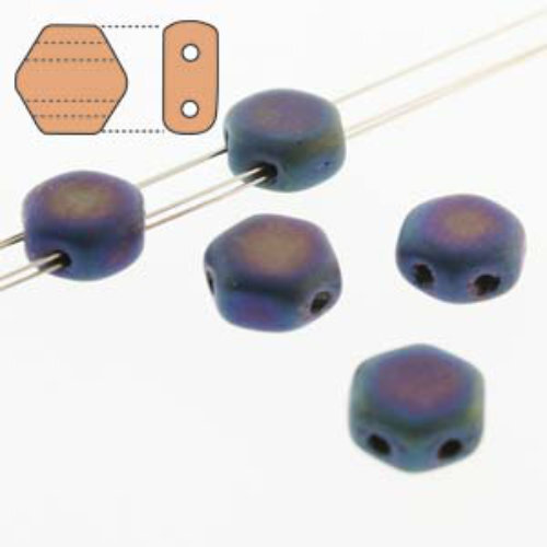 Size: 6mm x 7mm x 3mm Hole: 0.8mm Colour: HC0623980-21135 - Matte Jet Blue Iris Honeycomb beads are a fun hexagonal shape czech pressed glass two hole bead with guaranteed size and dimensional stability. They are not simply coated crystal but actual colored glass with many coating options. With two generously sized holes that run parallel through the points, they are perfect for bead stitching patterns, stringing projects, and more. These beads are available on a strand containing 30 beads.