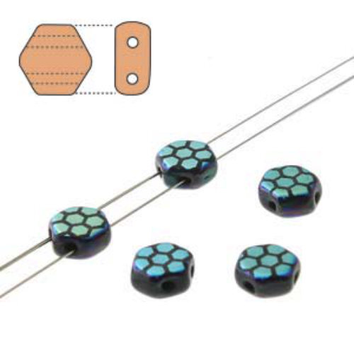 Size: 6mm x 7mm x 3mm Hole: 0.8mm Colour: HC0623980-28703HC - Jet AB Laser Core Honeycomb beads are a fun hexagonal shape czech pressed glass two hole bead with guaranteed size and dimensional stability. They are not simply coated crystal but actual colored glass with many coating options. With two generously sized holes that run parallel through the points, they are perfect for bead stitching patterns, stringing projects, and more. These beads are available on a strand containing 30 beads.