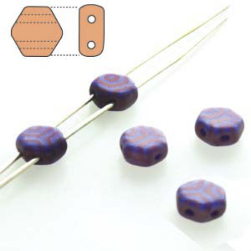 Size: 6mm x 7mm x 3mm Hole: 0.8mm Colour: HC0633050-84415WB - Matte Opaque Royal Blue Bronze Laser Web Honeycomb beads are a fun hexagonal shape czech pressed glass two hole bead with guaranteed size and dimensional stability. They are not simply coated crystal but actual colored glass with many coating options. With two generously sized holes that run parallel through the points, they are perfect for bead stitching patterns, stringing projects, and more. These beads are available on a strand containing 30 beads.