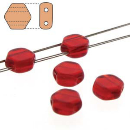 Size: 6mm x 7mm x 3mm Hole: 0.8mm Colour: HC0690080 - Transparent Ruby Honeycomb beads are a fun hexagonal shape czech pressed glass two hole bead with guaranteed size and dimensional stability. They are not simply coated crystal but actual colored glass with many coating options. With two generously sized holes that run parallel through the points, they are perfect for bead stitching patterns, stringing projects, and more. These beads are available on a strand containing 30 beads.