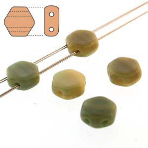 Size: 6mm x 7mm x 3mm Hole: 0.8mm Colour: HC0699991 - Hodge Podge Seafoam Honeycomb beads are a fun hexagonal shape czech pressed glass two hole bead with guaranteed size and dimensional stability. They are not simply coated crystal but actual colored glass with many coating options. With two generously sized holes that run parallel through the points, they are perfect for bead stitching patterns, stringing projects, and more. These beads are available on a strand containing 30 beads.