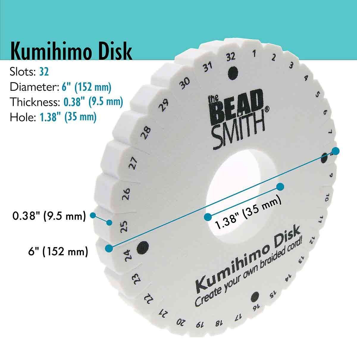 The Kumihimo Disk (KD600) is 6 inches in diameter and made of 3/8 inch dense foam.
