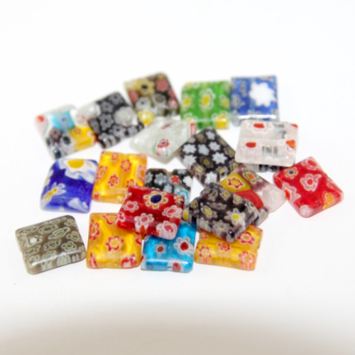 Patterned Glass beads created using a variety of glass canes. Mixed Colour 10mm x 12mm Flat Rectangle Millefiori Flower Beads - 10 Piece Bag
