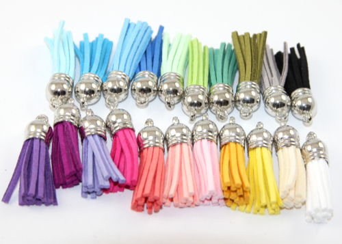 Faux suede tsssels are great for earrings, necklaces, bag tags and keyrings. A random mix of colours is in each bag. Mixed Colours 38mm Faux Suede Tassel - Bag of 10 - Silver Cap