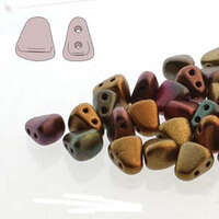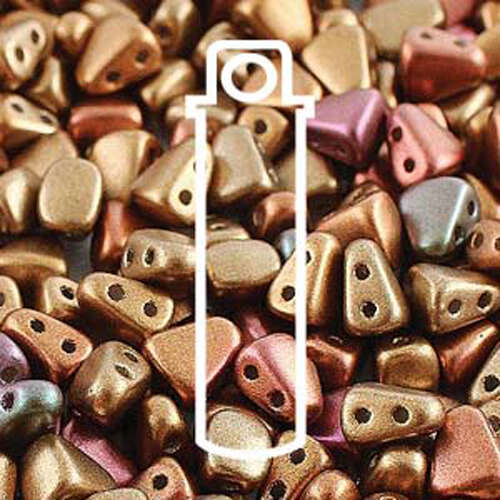 Style: Nib Bit Size: 6mm x 5mm Beads Inner Hole: 2 x 0.8mm Product Code: NB6500030-01620 Colour: Dark Gold Rainbow The Matubo NIB-BIT beads are a small wedge shape, like that of a corn kernel and were designed by Nela Kábelová. The two stringing holes run horizontally through the shape, providing you with fun beading opportunities. Matubo Nib-bit beads are finished with a high shine similar to that of fire polished beads and certainly much shiner than regular Czech glass beads. The holes in the Nib-bit beads are well finished and smooth so that they will not damage your stringing material. These beads are available in reusable tubes or in bags. 23gm tube contains approximately 130 - 150 beads 50gm bag contains approximately 300 - 310 beads 100gm bag contains approximately 610 - 620 beads