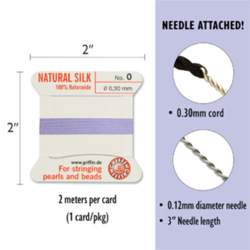 GRIFFIN 100% Natural Silk is made exclusively from the high-grade filament of the silk cocoon. Only this sleek thread has the characteristic lustre and the irresistible natural beauty of pure natural silk.The individual cards have two metres (approx. 79'') of 100% natural thread with a stainless steel needle attached No 0 - 0.30mm - Lilac Carded Bead Cord 100% Natural Silk