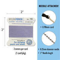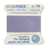 GRIFFIN NylonPower is a strong, specially treated nylon with double the tensile strength of conventional nylon. NylonPower Bead Cord stretches only about 3-4% under tension and will return to its original length when released. This property is a great advantage when beading, because knots can be placed very firmly and permanently. Apart from the resilient characteristics of this thread, GRIFFIN NylonPower also possesses a smooth surface and an unsurpassed brilliance. GRIFFIN PowerNylon: a modern alternative to traditional 100% Natural Silk thread. No 10 - 0.90mm - Lilac Carded Bead Cord Nylon Power