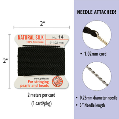 GRIFFIN 100% Natural Silk is made exclusively from the high-grade filament of the silk cocoon. Only this sleek thread has the characteristic lustre and the irresistible natural beauty of pure natural silk.The individual cards have two metres (approx. 79'') of 100% natural thread with a stainless steel needle attached No 14 - 1.02mm - Black Carded Bead Cord 100% Natural Silk
