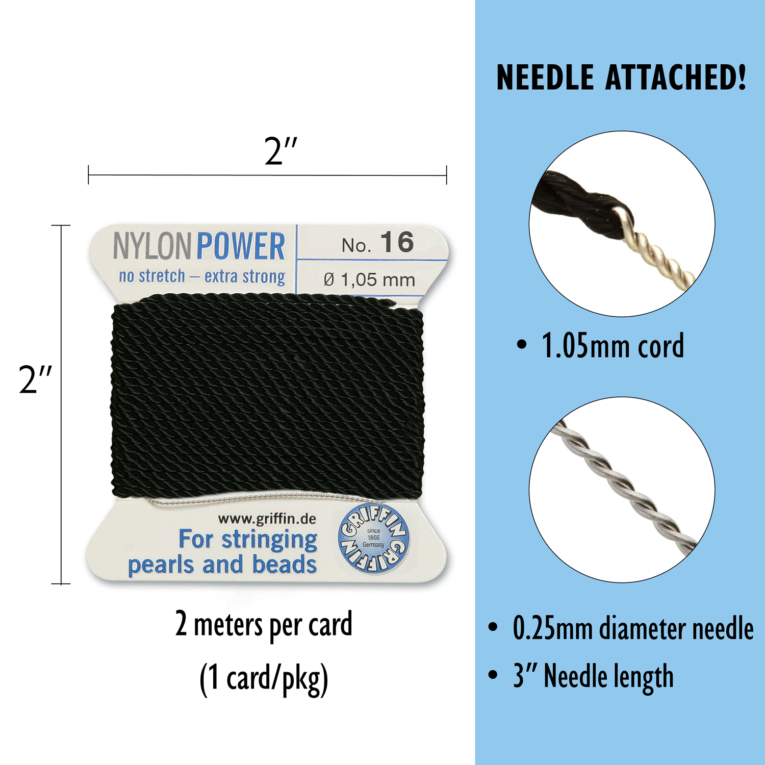 GRIFFIN NylonPower is a strong, specially treated nylon with double the tensile strength of conventional nylon. NylonPower Bead Cord stretches only about 3-4% under tension and will return to its original length when released. This property is a great advantage when beading, because knots can be placed very firmly and permanently. Apart from the resilient characteristics of this thread, GRIFFIN NylonPower also possesses a smooth surface and an unsurpassed brilliance. GRIFFIN PowerNylon: a modern alternative to traditional 100% Natural Silk thread. No 16 - 1.05mm - Black Carded Bead Cord Nylon Power