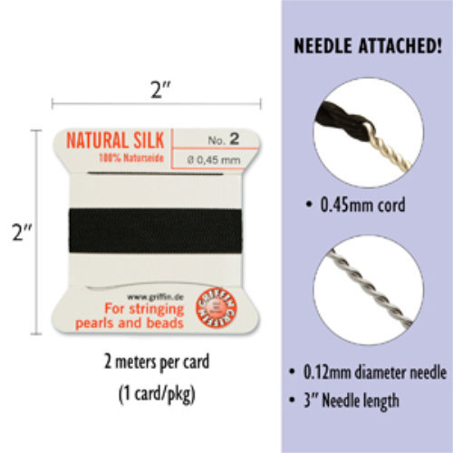 GRIFFIN SILK CORD - Silk has been the traditional material for stringing beads for centuries. Pure natural silk feels incredibly soft and smooth. Silk threads have good tensile strength and little stretch and can therefore be easily worked with and knotted. Necklaces made with natural silk drape naturally around the contours of the body and always project a look of elegance and beauty. GRIFFIN 100% Natural Silk is made exclusively from the high-grade filament of the silk cocoon. Only this sleek thread has the characteristic lustre and the irresistible natural beauty of pure natural silk.The individual cards have two metres (approx. 79'') of 100% natural thread with a stainless steel needle attached No 2 - 0.45mm - Black Carded Bead Cord 100% Natural Silk