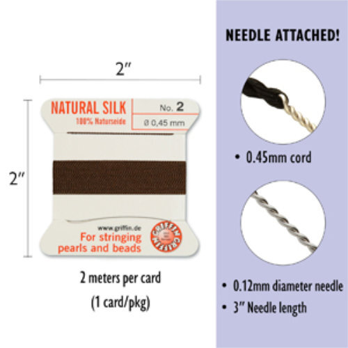 GRIFFIN 100% Natural Silk is made exclusively from the high-grade filament of the silk cocoon. Only this sleek thread has the characteristic lustre and the irresistible natural beauty of pure natural silk.The individual cards have two metres (approx. 79'') of 100% natural thread with a stainless steel needle attached No 2 - 0.45mm - Brown Carded Bead Cord 100% Natural Silk
