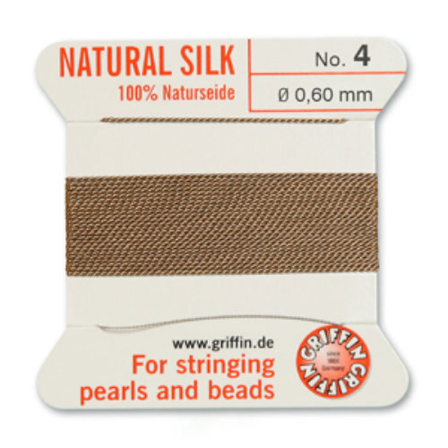 GRIFFIN SILK CORD - Silk has been the traditional material for stringing beads for centuries. Pure natural silk feels incredibly soft and smooth. Silk threads have good tensile strength and little stretch and can therefore be easily worked with and knotted. Necklaces made with natural silk drape naturally around the contours of the body and always project a look of elegance and beauty. GRIFFIN 100% Natural Silk is made exclusively from the high-grade filament of the silk cocoon. Only this sleek thread has the characteristic lustre and the irresistible natural beauty of pure natural silk.The individual cards have two metres (approx. 79'') of 100% natural thread with a stainless steel needle attached No 4 - 0.60mm - Beige Carded Bead Cord 100% Natural Silk