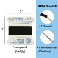 GRIFFIN NylonPower is a strong, specially treated nylon with double the tensile strength of conventional nylon. NylonPower Bead Cord stretches only about 3-4% under tension and will return to its original length when released. This property is a great advantage when beading, because knots can be placed very firmly and permanently. Apart from the resilient characteristics of this thread, GRIFFIN NylonPower also possesses a smooth surface and an unsurpassed brilliance. GRIFFIN PowerNylon: a modern alternative to traditional 100% Natural Silk thread. No 6 - 0.70mm - Black Carded Bead Cord Nylon Power