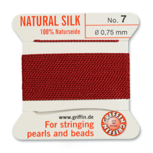 GRIFFIN 100% Natural Silk is made exclusively from the high-grade filament of the silk cocoon. Only this sleek thread has the characteristic lustre and the irresistible natural beauty of pure natural silk.The individual cards have two metres (approx. 79'') of 100% natural thread with a stainless steel needle attached No 7 - 0.75mm - Garnet Carded Bead Cord 100% Natural Silk