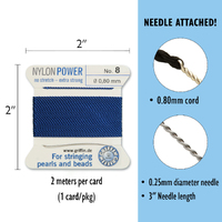 Sold Out - Backorder AvailableGRIFFIN NylonPower is a strong, specially treated nylon with double the tensile strength of conventional nylon. NylonPower Bead Cord stretches only about 3-4% under tension and will return to its original length when released. This property is a great advantage when beading, because knots can be placed very firmly and permanently. Apart from the resilient characteristics of this thread, GRIFFIN NylonPower also possesses a smooth surface and an unsurpassed brilliance. GRIFFIN PowerNylon: a modern alternative to traditional 100% Natural Silk thread. No 8 - 0.80mm - Dark Blue Carded Bead Cord Nylon Power
