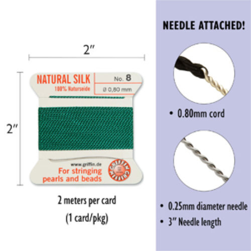 GRIFFIN 100% Natural Silk is made exclusively from the high-grade filament of the silk cocoon. Only this sleek thread has the characteristic lustre and the irresistible natural beauty of pure natural silk.The individual cards have two metres (approx. 79'') of 100% natural thread with a stainless steel needle attached No 8 - 0.80mm - Green Carded Bead Cord 100% Natural Silk