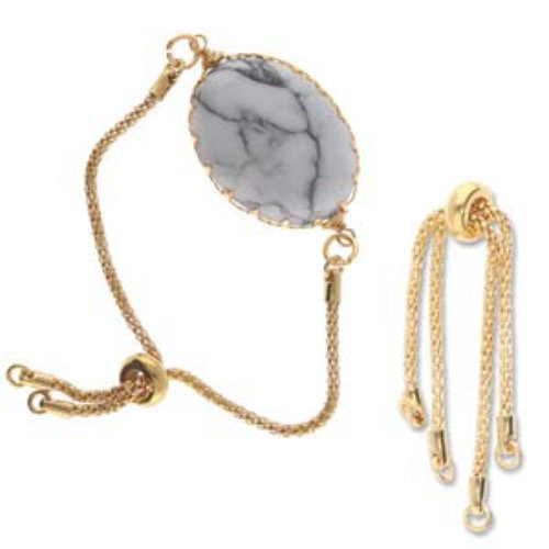 In StockStyle : Partially Finished Bracelet Finish: Gold Size: 6"(15cm), single chain length: about 7.5cm, 2mm wide, hole: 2.5~3mm, beads: 10x4mm, charm: 8.5x5mm. Item Code: PFBE-GP If you are looking to add a little something special to finish your bracelet this adjustable slider chain bracelet end is just the thing! Featuring two strands of high quality box chain with a slider stopper to adjust the circumference to fit the wrist size. Each chain has a jump ring on one end to attach to your project. This bracelet ending will add elegance and style to any design.'