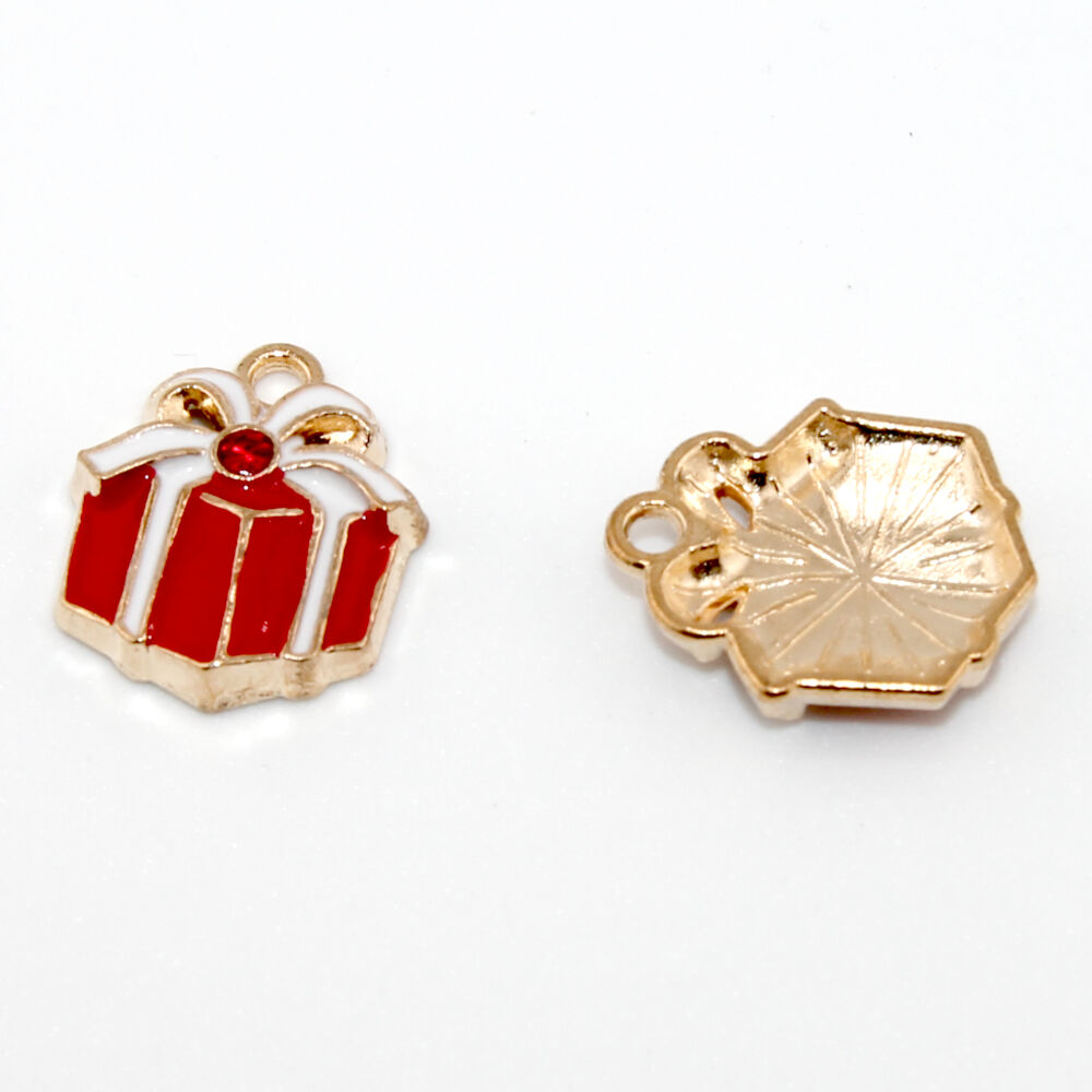 Red & White Christmas Present with Rhinestone Enamel Charm - Pale Gold - 2 Pieces