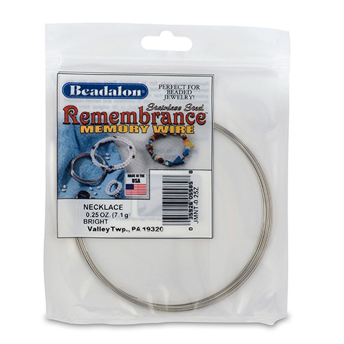 In StockMemory Wire is one of the easiest stringing materials to use. Because of its hard temper, it holds its shape. It is incredibly easy to finish-off as well - you can simply use a Round Nose Pliers or Memory Wire Finishing Pliers to turn the ends into a small loop, or choose from a variety of findings specifically designed to finish Memory Wire. Remembrance Memory Wire is stainless steel wire, made into coils, and sized for rings, bracelets, and necklaces. The diameters are given in ranges to account for the variations in the manufacturing process. Remembrance is made in the USA, and is the highest quality available. Remembrance Memory Wire - Necklace - 9 coil pack (0.25 oz / 7g) - Bright - JMNT-0.25Z