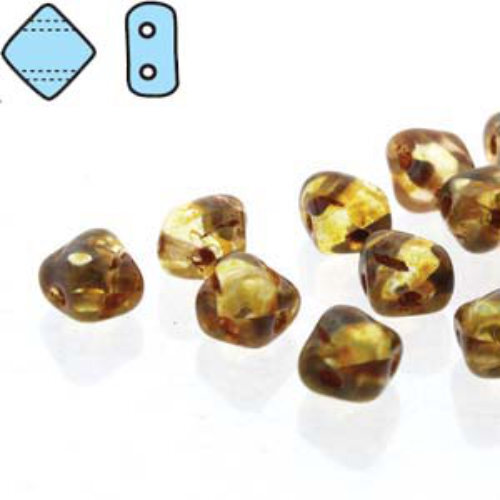 Sold Out - Backorder AvailableSize: 5mm x 5mm x 3mm Hole: 0.8mm Colour: 790524720743 - Crystal Travertine Silky Beads are a square bead with a ridge running along the diagonal on one side and flat on the other - giving you the choice to use either side in your design. The silky beads are a czech pressed glass two hole bead with guaranteed size and dimensional stability. With two generously sized holes that run parallel through the bead, they will nestle together beautifully or can be mixed with other 2 hole and single hole beads, making then perfect for bead stitching patterns, stringing projects, and more. Silky Beads are available in 5mm, 6mm and 6mm Table Cuts.