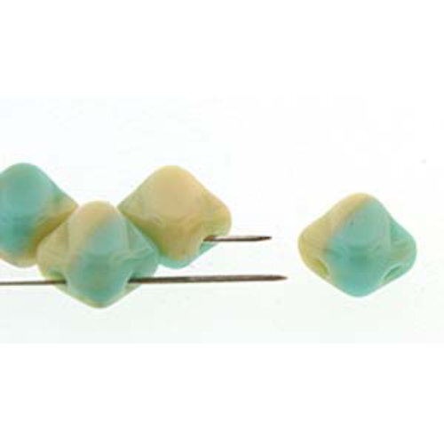 Size: 6mm x 6mm x 3mm Hole: 0.8mm Colour: 790524940905 - Green Turquoise Beige Blend Silky Beads are a square bead with a ridge running along the diagonal on one side and flat on the other - giving you the choice to use either side in your design. The silky beads are a czech pressed glass two hole bead with guaranteed size and dimensional stability. With two generously sized holes that run parallel through the bead, they will nestle together beautifully or can be mixed with other 2 hole and single hole beads, making then perfect for bead stitching patterns, stringing projects, and more. Silky Beads are available in 5mm, 6mm and 6mm Table Cuts.