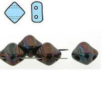 Size: 6mm x 6mm x 3mm Hole: 0.8mm Colour: 790524454853 - Jet Iris Luster Silky Beads are a square bead with a ridge running along the diagonal on one side and flat on the other - giving you the choice to use either side in your design. The silky beads are a czech pressed glass two hole bead with guaranteed size and dimensional stability. With two generously sized holes that run parallel through the bead, they will nestle together beautifully or can be mixed with other 2 hole and single hole beads, making then perfect for bead stitching patterns, stringing projects, and more. Silky Beads are available in 5mm, 6mm and 6mm Table Cuts.
