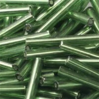 Bugle Beads are tubular glass beads made in the same production manner as seed beads, however, they are cut glass rods that have been tumbled for smooth edges. Bugle Beads come in a variety of lengths. These 20mm Bugle Bead are made from glass they are Silver Lined Green and sold in a 8gm Bag