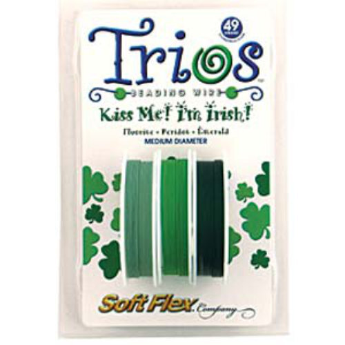 Colour: Kiss Me Im Irish Code: TRI019KIS Thickness: .019 in (0.48 mm) Pack Size: 10ft / 3m - Soft Flex Trios Wire Sets are comprised of three 10' (3m) spools of Soft Flex brand beading wire. Trios Wire Sets reflect our passion for gemstones and our love of color. Made in the USA. Kiss Me I'm Irish Trios contains a ten foot spool of each of these colors - Green Emerald Fluorite and Peridot