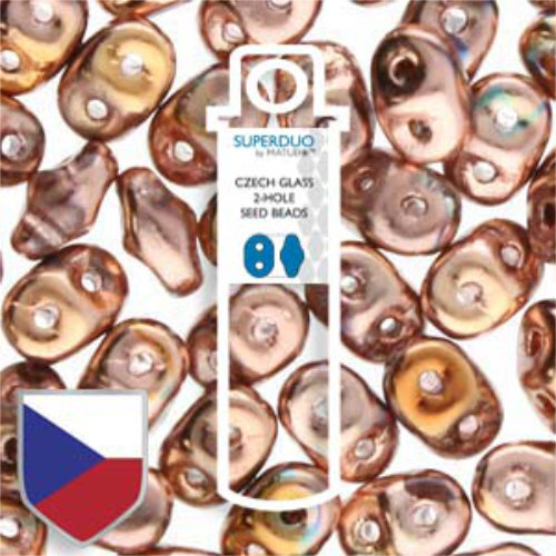 Sold Out - Backorder AvailableStyle: Super Duo Size: 2.5mm x 5mm Beads Inner Hole: 0.8mm Product Code: DU0500030-27103CS Colour: Crystal Full Capri Gold Super Duos are a Czech pressed glass two hole bead with guaranteed size and dimensional stability. They are not simply coated crystal but actual colored glass with many coating options: Transparent, Opaque, Matte, Color Lined, Picasso, Luster, AB Coating & Magic Line. With two generously sized holes that run parallel through the points, they are perfect for bead stitching patterns, stringing projects, and more. These beads are available in reusable tubes or in bags. 22.5gm tube contains approximately 290 - 310 beads 100gm bag contains approximately 1340 - 1360 beads These beads have been treated with Czech Shield - a transparent surface treatment for Czech Beads designed to increase colour durability and protection to Czech Bead Coatings.