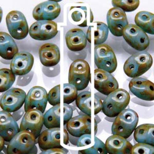 Sold Out - Backorder AvailableStyle: Super Duo Size: 2.5mm x 5mm Beads Inner Hole: 0.8mm Product Code: DU0563030-86805 Colour: Turquoise Blue Dark Travertine Super Duos are a Czech pressed glass two hole bead with guaranteed size and dimensional stability. They are not simply coated crystal but actual colored glass with many coating options: Transparent, Opaque, Matte, Color Lined, Picasso, Luster, AB Coating & Magic Line. With two generously sized holes that run parallel through the points, they are perfect for bead stitching patterns, stringing projects, and more. These beads are available in reusable tubes or in bags. 22.5gm tube contains approximately 290 - 310 beads 100gm bag contains approximately 1340 - 1360 beads