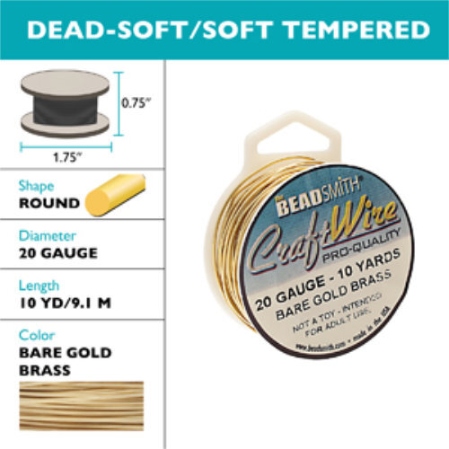 Sold Out - Backorder AvailableTarnish Resistant Soft Temper Bare Gold Brass 20 Gauge Round Wire Permanently Colored Non-tarnish Craft Wire. Great for all sorts of projects, including wire crocheted necklaces, bracelets, earrings, and rings. Dead-soft wire is extremely flexible which makes it ideal for creating flowing curves, shapes, and spirals, as well as for wrapping stones. Because of this flexibility, it can also be easily unbent, so when it is used to create an element like a clasp, which will be subjected to high stress, it should be hardened after shaping. This can be done by placing it on an anvil or bench block and striking it with a nylon-jaw hammer. "