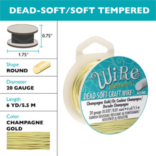 Tarnish Resistant Soft Temper Champagne Gold 20 Gauge Round Wire Permanently Colored Non-tarnish Craft Wire. Great for all sorts of projects, including wire crocheted necklaces, bracelets, earrings, and rings. Dead-soft wire is extremely flexible which makes it ideal for creating flowing curves, shapes, and spirals, as well as for wrapping stones. Because of this flexibility, it can also be easily unbent, so when it is used to create an element like a clasp, which will be subjected to high stress, it should be hardened after shaping. This can be done by placing it on an anvil or bench block and striking it with a nylon-jaw hammer. "