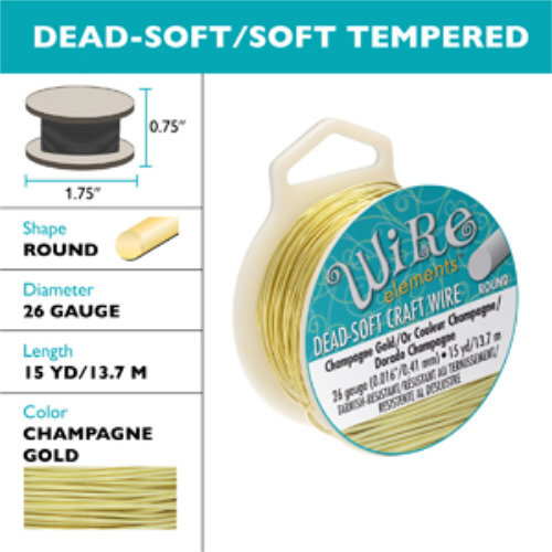 Tarnish Resistant Soft Temper Champagne Gold 26 Gauge Round Wire Permanently Colored Non-tarnish Craft Wire. Great for all sorts of projects, including wire crocheted necklaces, bracelets, earrings, and rings. Dead-soft wire is extremely flexible which makes it ideal for creating flowing curves, shapes, and spirals, as well as for wrapping stones. Because of this flexibility, it can also be easily unbent, so when it is used to create an element like a clasp, which will be subjected to high stress, it should be hardened after shaping. This can be done by placing it on an anvil or bench block and striking it with a nylon-jaw hammer. "