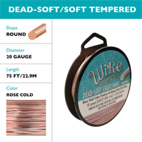 Tarnish Resistant Soft Temper Rose Gold 20 Gauge Round Wire Permanently Colored Non-tarnish Craft Wire. Great for all sorts of projects, including wire crocheted necklaces, bracelets, earrings, and rings. Dead-soft wire is extremely flexible which makes it ideal for creating flowing curves, shapes, and spirals, as well as for wrapping stones. Because of this flexibility, it can also be easily unbent, so when it is used to create an element like a clasp, which will be subjected to high stress, it should be hardened after shaping. This can be done by placing it on an anvil or bench block and striking it with a nylon-jaw hammer. "